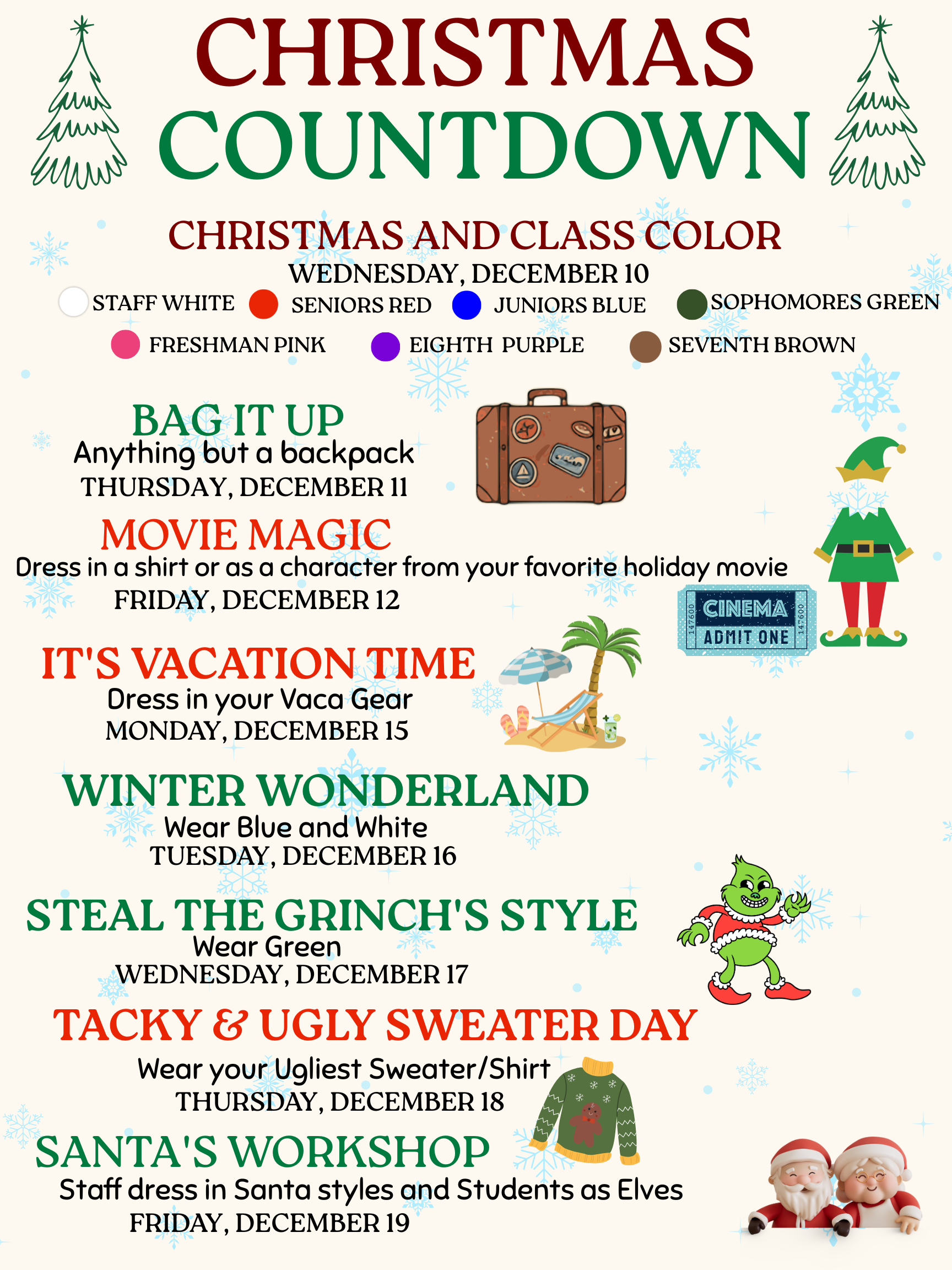 The countdown closes Friday, December 19, with Santa’s workshop day. Staff dress in Santa styles, and students fill the halls as elves.